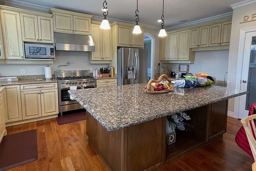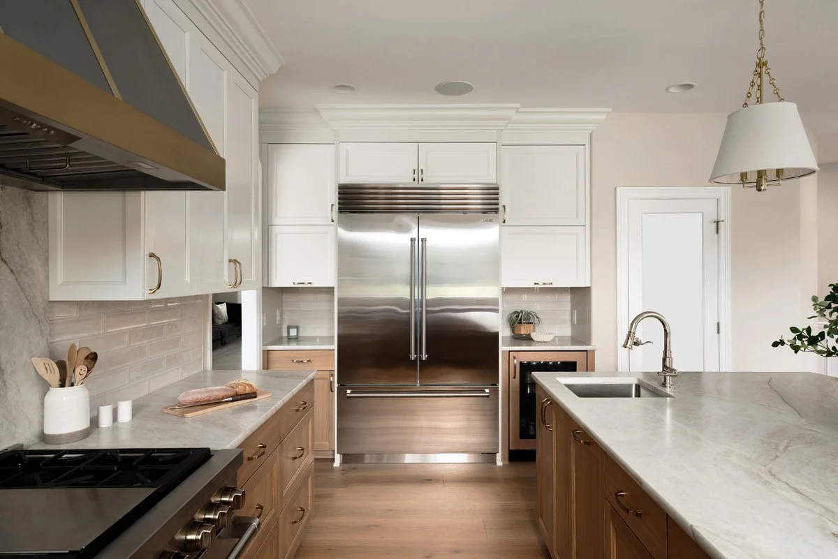 Designed for performance, the layout features a reworked island with a prep sink and Brizo Rook faucet, along with polished nickel fixtures and a wall-mounted pot filler for cohesive detailing. A Sub-Zero refrigerator and high-end appliance integration—including a 48" Wolf range—bring both functionality and luxury. Appliance garages and streamlined storage reinforce clean lines and efficiency.