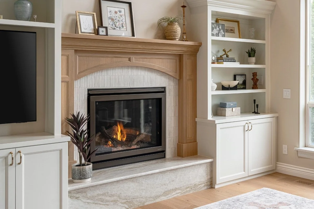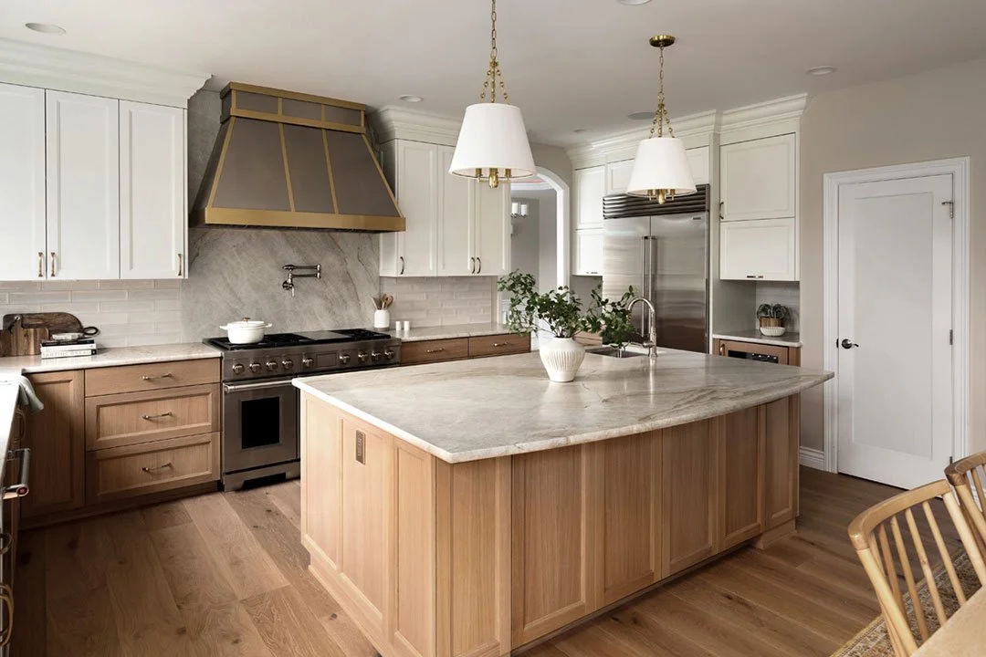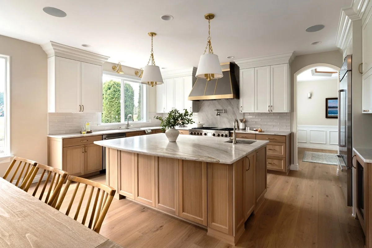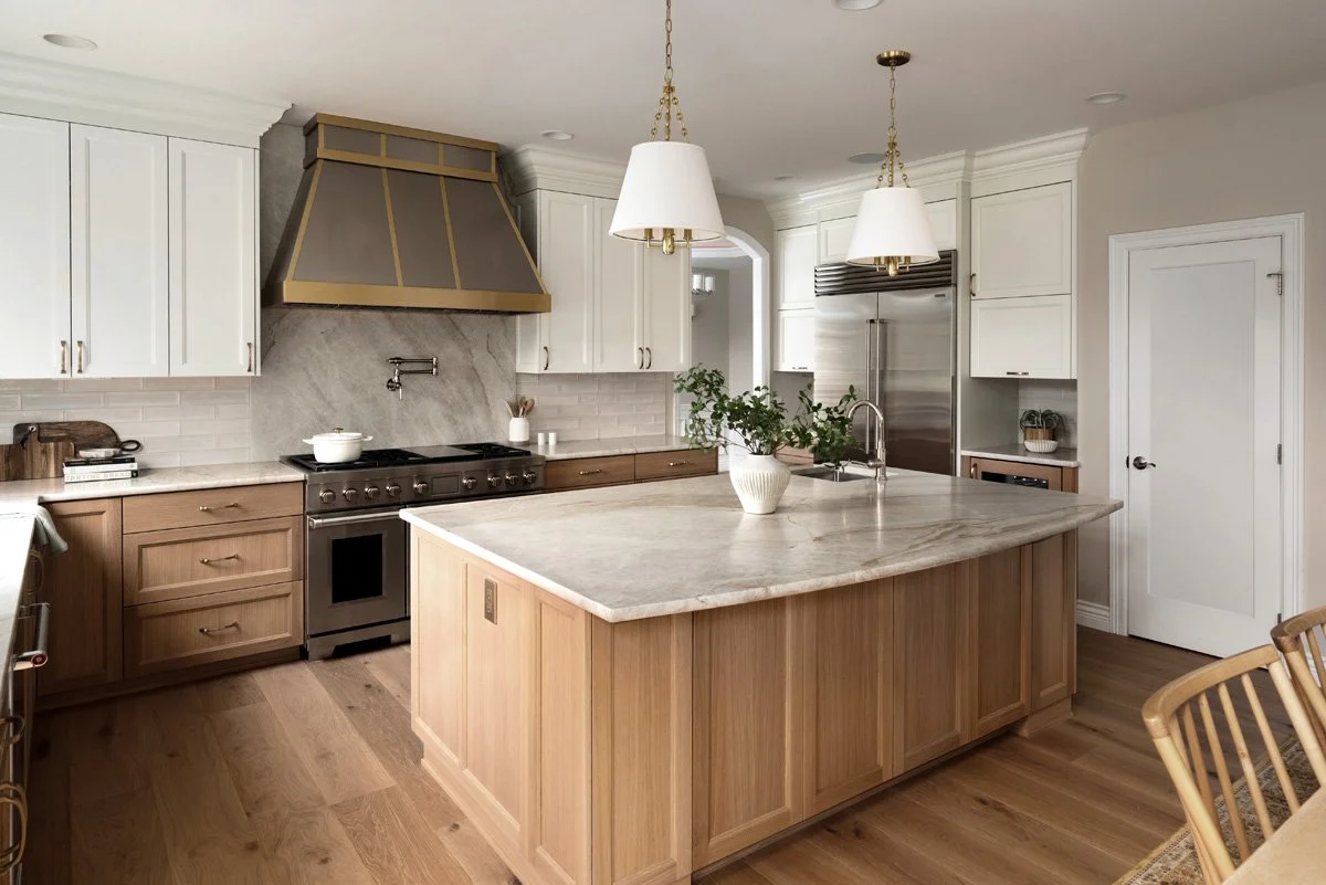 Rift white oak cabinetry, painted uppers, champagne bronze hardware, and OPUS Pescara engineered hardwood flooring bring warmth and continuity, while layered lighting and a leveled ceiling elevate the entire space. We tied in the living room space with a custom designed and built fireplace mantel in white oak and added custom built-in cabinets for display and storage. This luxury kitchen and living room renovation balances refined design with everyday livability.