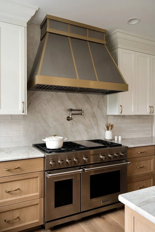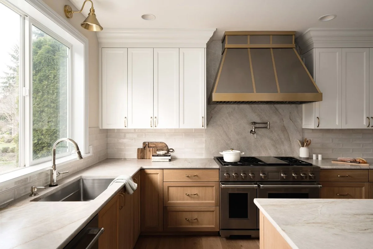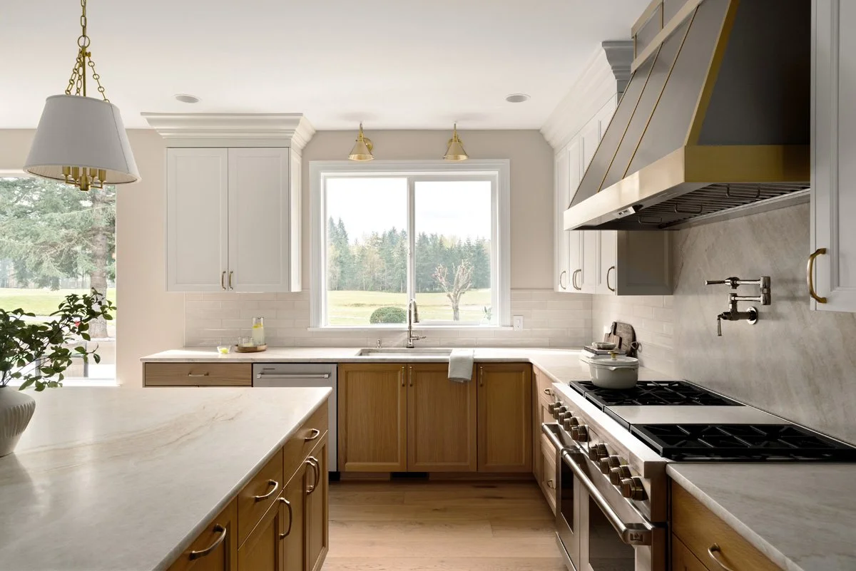 The StoryOverlooking the 4th hole at Washington National Golf Course, this original kitchen and living room was reimagined for clarity, function, and lasting quality. Leathered Taj Mahal quartzite anchors the space, wrapping the countertops and range wall in soft movement and understated luxury. A custom metal hood with brass strap detailing creates a strong focal point, complemented by warm metallic accents throughout.