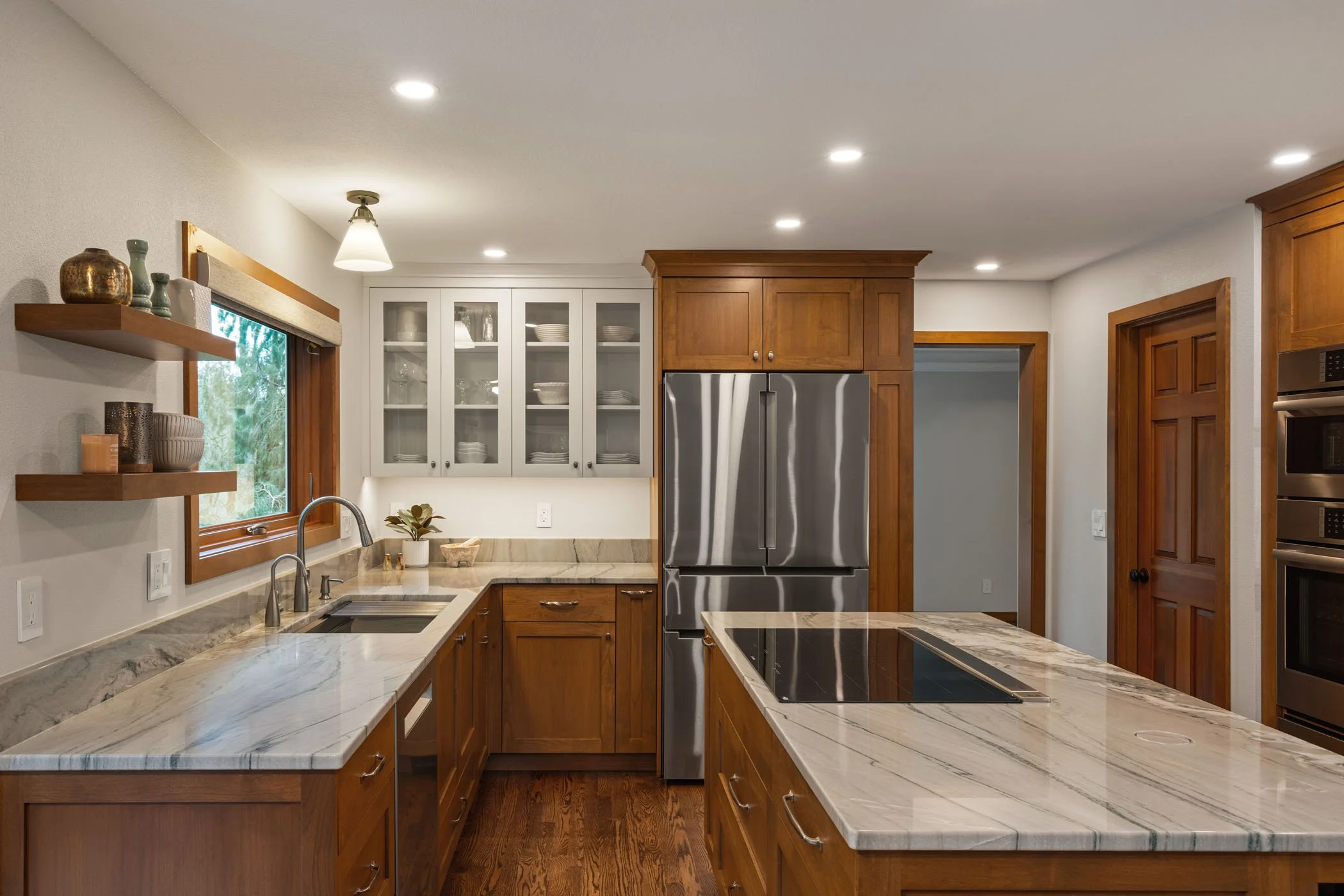 Custom alder wood cabinets, striking quartzite countertops, and classic Carrara marble bring warmth and texture to the interior, creating a seamless connection to the home’s surroundings. The result is what we’ve coined a true "revival"—a thoughtful reimagining that honors the home’s original character while elevating its style and functionality for modern living.